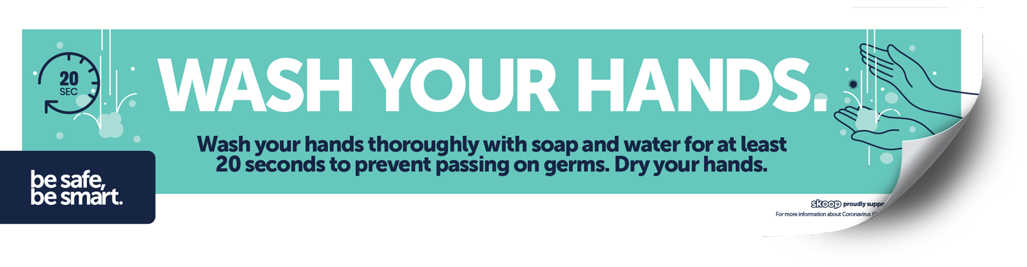 ** PRICED TO CLEAR - WHILE STOCKS LAST ** Was $44.30, now $20.00 - 28 units in stock as at 15/02/21 A set of 4 mirror decals with key messaging around washing/sanitising and social distance. Designed for bathroom mirrors, but will stick to any smooth surface. • Easy to install and re-position • 90cm wide x 21cm high • Re-positional wall vinyl low-tack cling 4 decals communicating key messages: • 2 x WASH YOUR HANDS • 2 x SANITISE YOUR HANDS SKU: RTS025