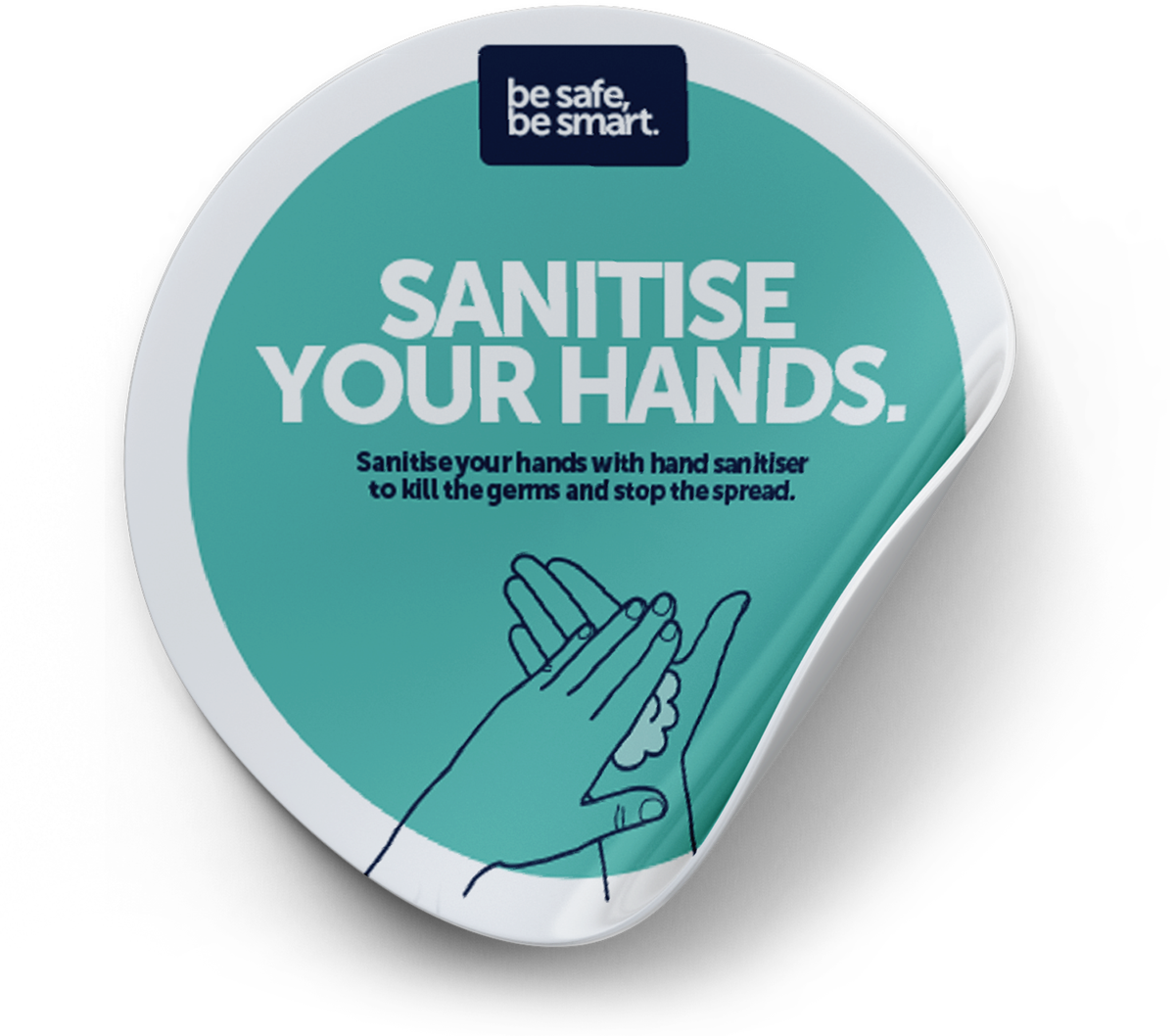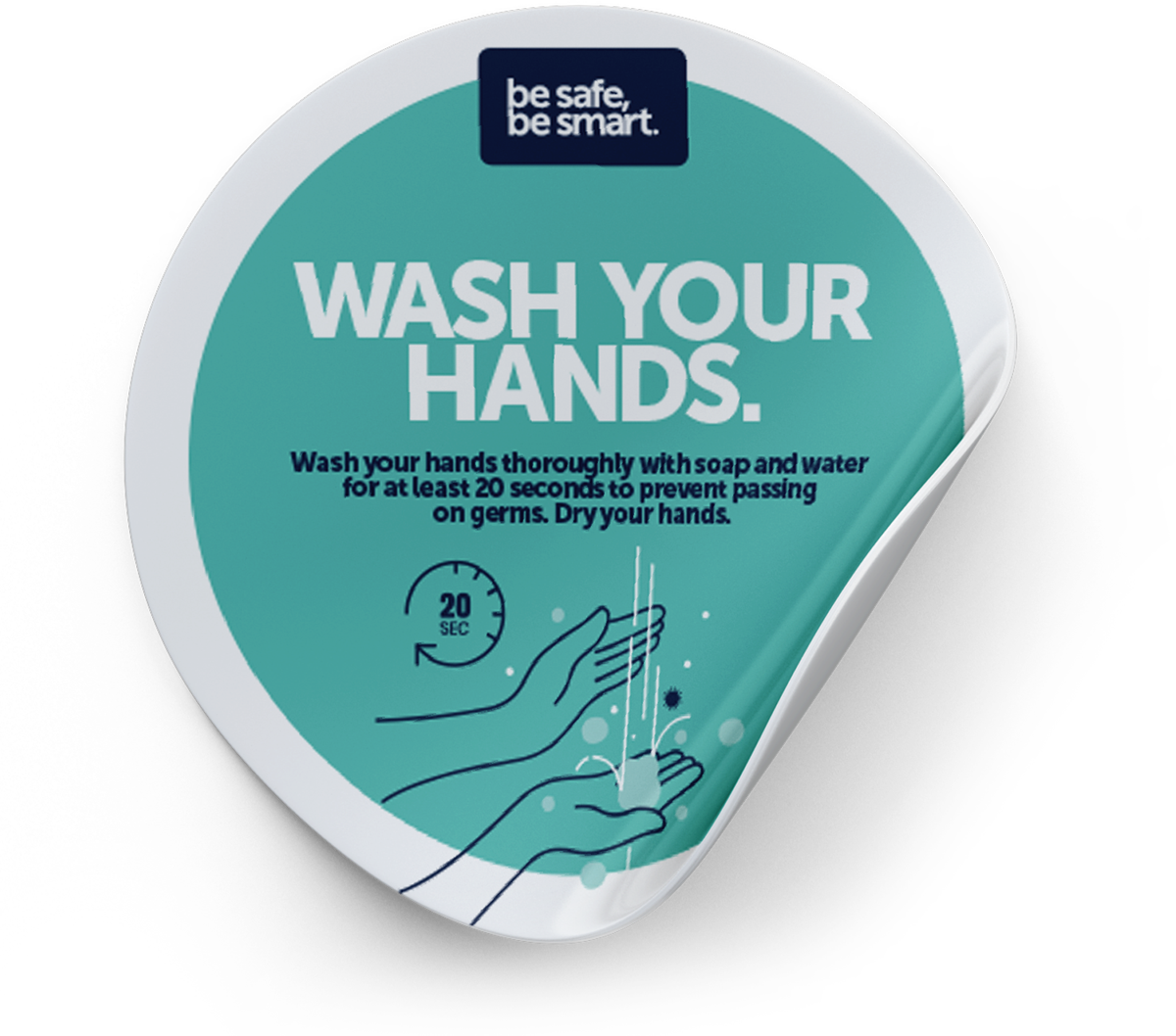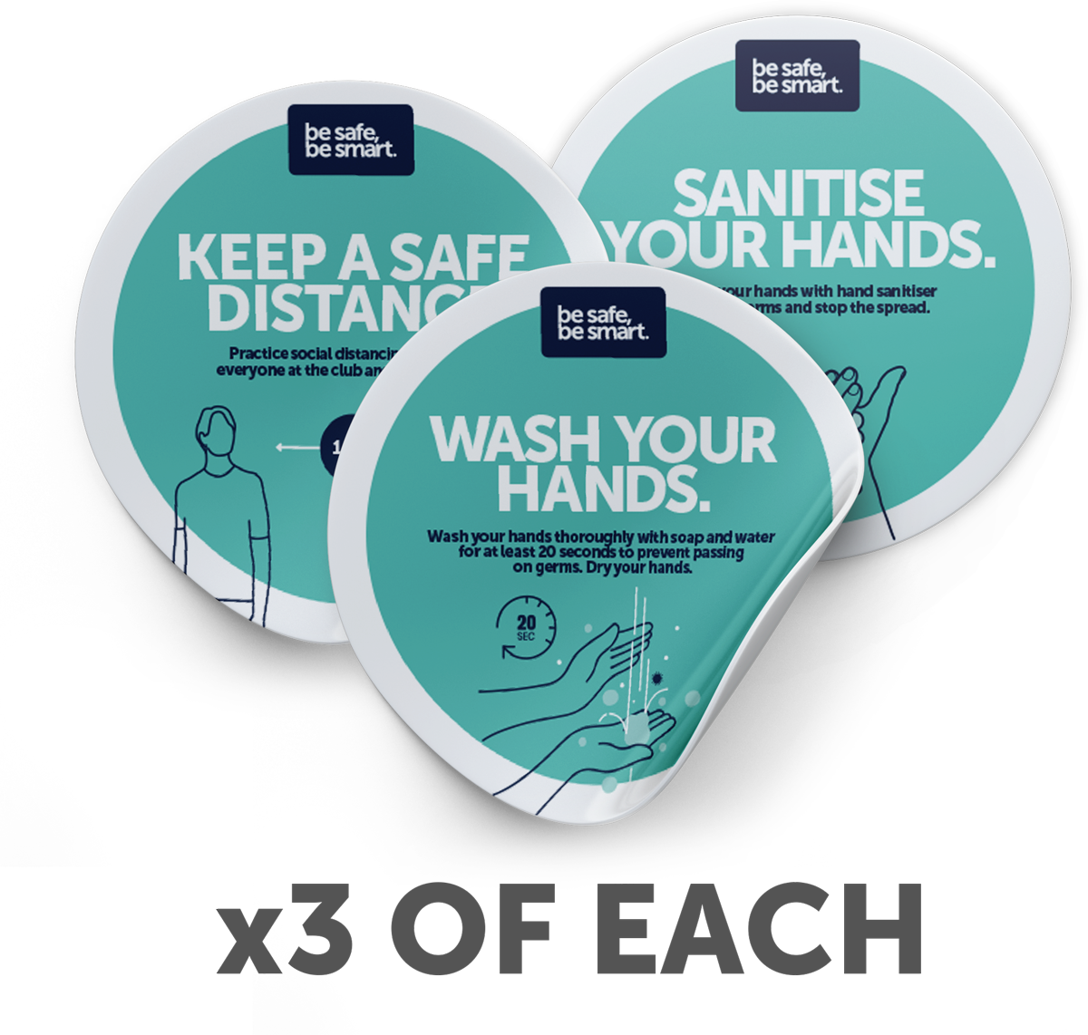 ** PRICED TO CLEAR - WHILE STOCKS LAST ** Was $14.90, now $5.00 - 12 units in stock as at 15/02/21 A set of 9 mirror decals with key messaging around washing, sanitising and social distance. Designed for bathroom mirrors, but will stick to any smooth surface. • Easy to install and re-positionable • 150mm diameter in size • Re-positional wall vinyl low-tack cling 9 Decals communicating key messages: • 3 x WASH YOUR HANDS • 3 x SANITISE YOUR HANDS • 3 x SOCIAL DISTANCING SKU: RTS018
