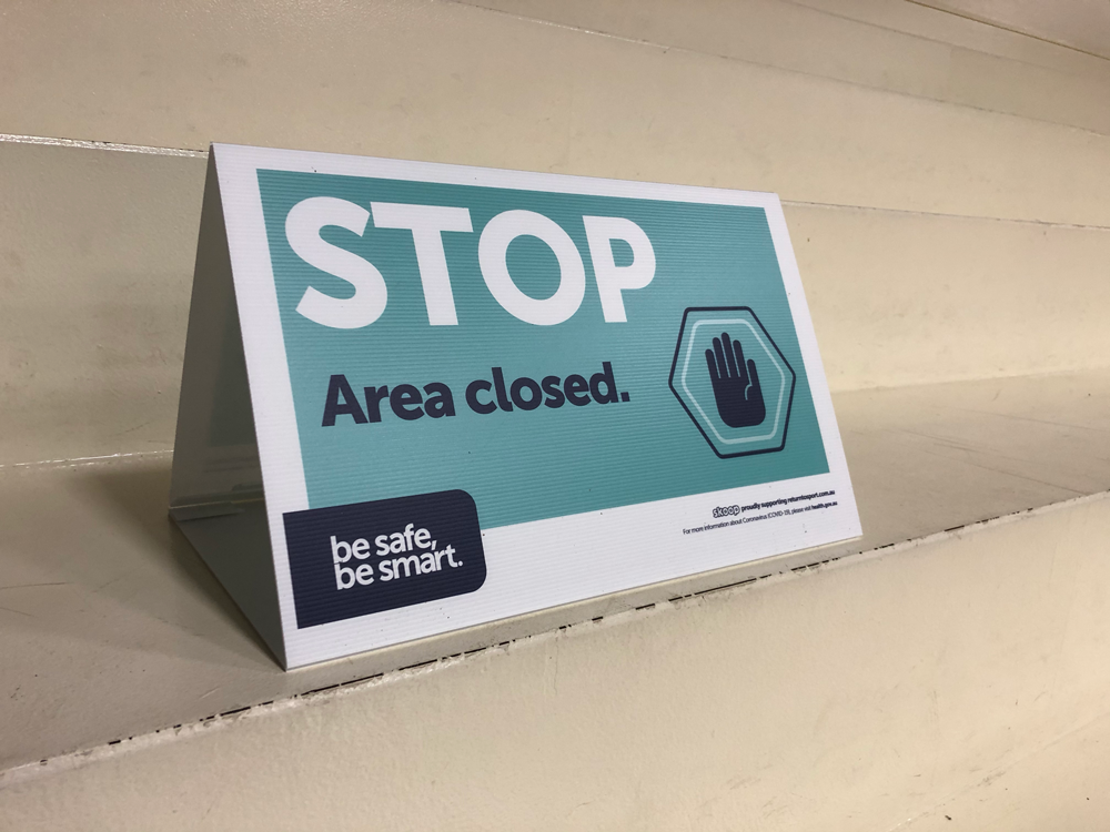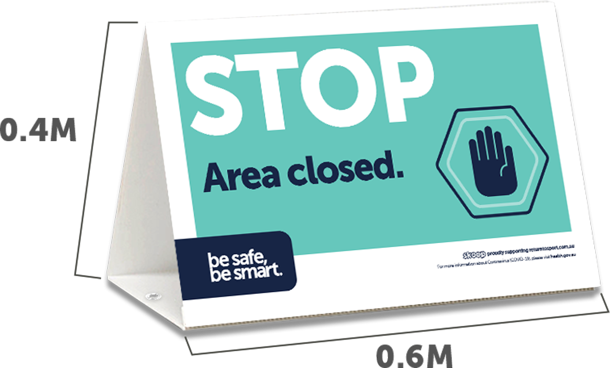 ** PRICED TO CLEAR - WHILE STOCKS LAST ** Was $33.50, now $10 - 93 units in stock as at 15/02/21 Tri-signs are an ultra-cost-effective way to communicate closed / prohibited areas such as grand stands, officials facilities, playing areas and other controlled spaces. • 2 x Tri-signs • 60cm wide x 40cm tall • Supplied flat with an easy-to-assemble, interlocking base • 5mm corflute • Suitable for indoor and outdoor use (tent pegs or sand-bag recommended for outdoors) SKU: RTS030