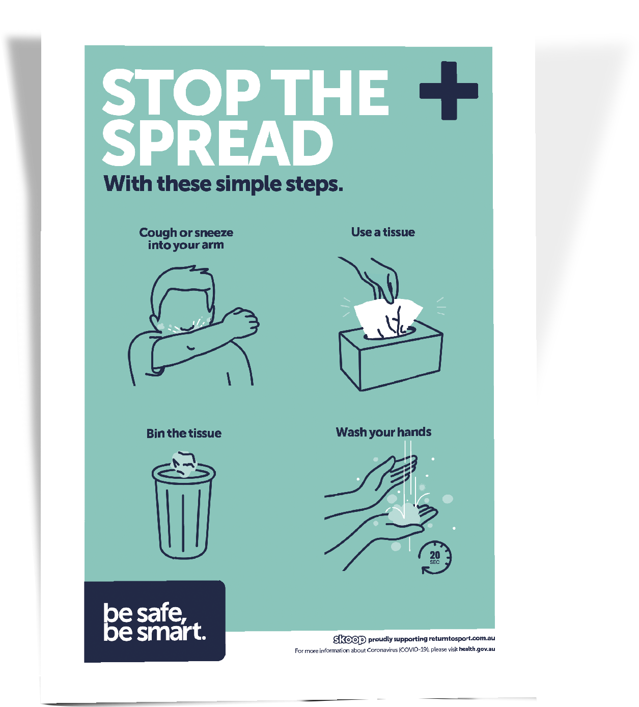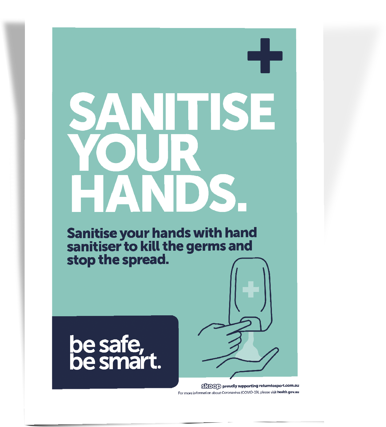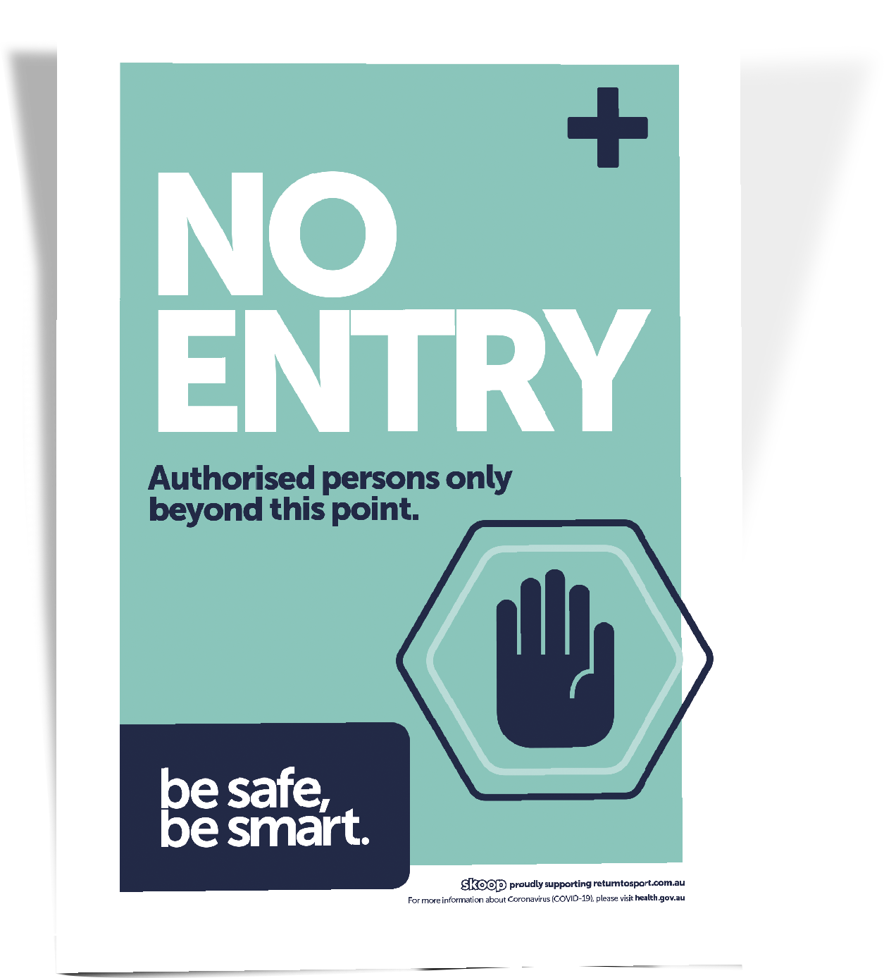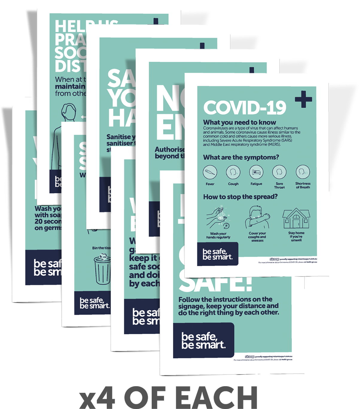 ** PRICED TO CLEAR - WHILE STOCKS LAST ** Was $74.90, now $28.00 - 37 units in stock as at 15/02/21 32 posters to communicate key COVID-19 information, social distancing guidelines and hygiene messaging. • A2 in size (420mm x 594mm) • Suitable for indoor use • Single-sided print on quality poster paper 8 key messages x 4 of each: • 4 x WELCOME BACK! • 4 x KEEP THE CLUB SAFE! • 4 x COVID-19 information • 4 x NO ENTRY authorised persons only beyond this point • 4 x STOP THE SPREAD • 4 x SANITISE YOUR HANDS • 4 x WASH YOUR HANDS • 4 x SOCIAL DISTANCING SKU: RTS001