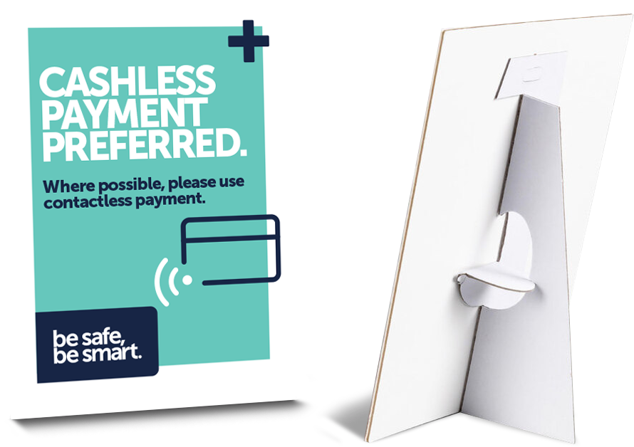 ** PRICED TO CLEAR - WHILE STOCKS LAST ** Was $17.50, now $8.00 - 30 units in stock as at 15/02/21 A set of 2 x A3 posters and 1 x free-standing counter card to communicate cashless payment preferred. Suitable for venue entry desks, canteens and merchandise shops. • Counter card is A4 in size (210mm wide x 297mm tall) • 2 x A3 posters (supplied folded) • Suitable for indoor use only SKU: RTS053